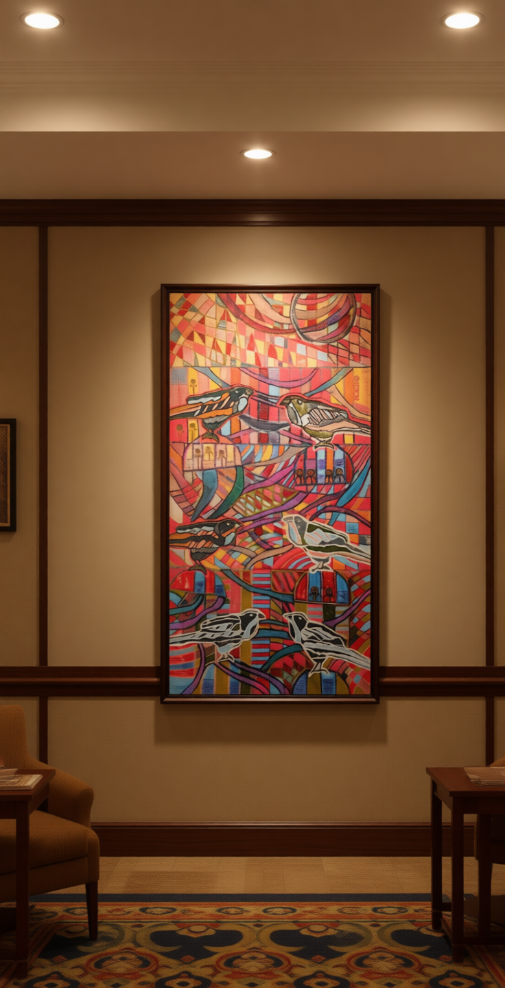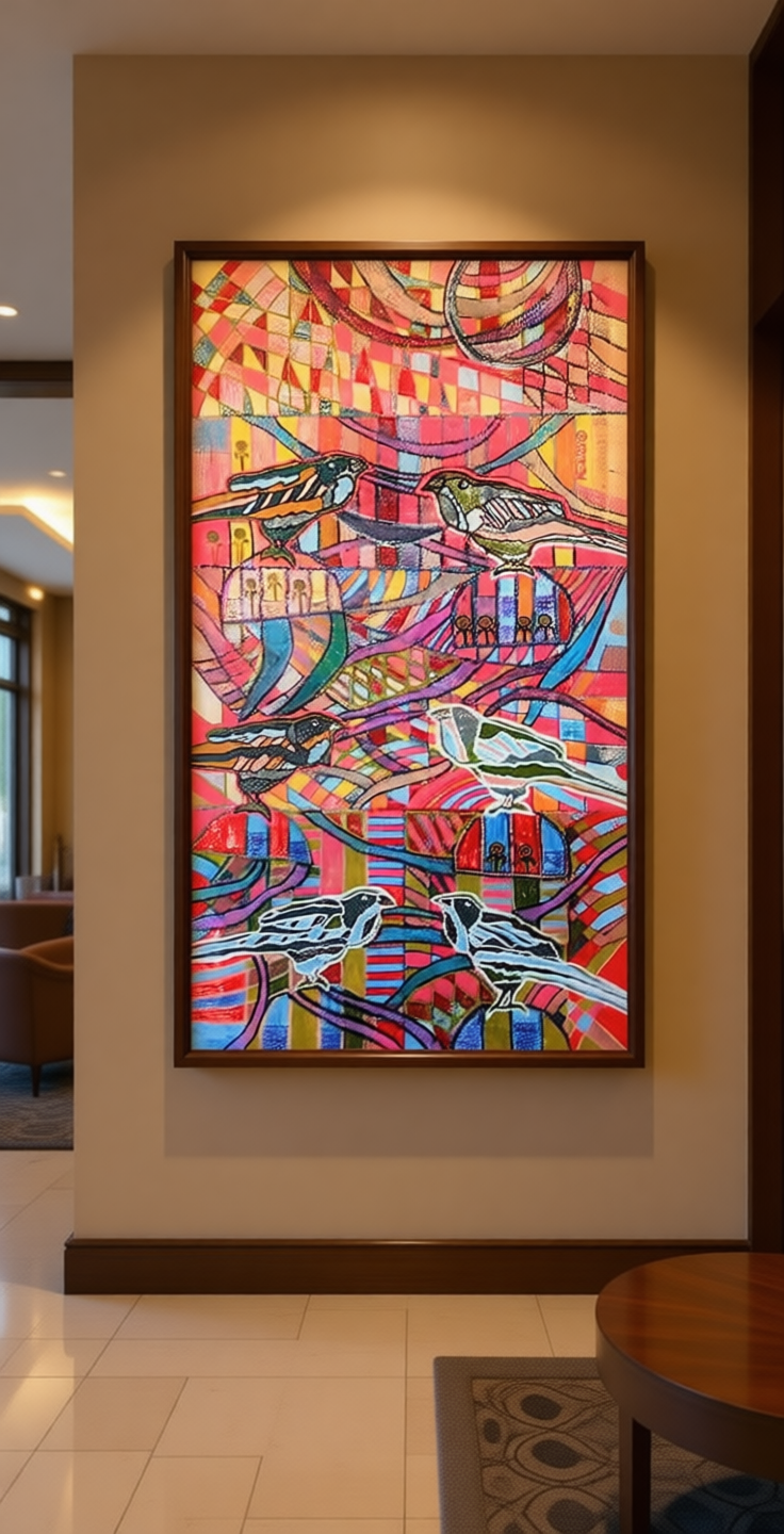 Мнение одного зрителя: "Каждая птица — отдельный персонаж: одни смотрят, как будто только что выиграли в лотерею, другие — как будто спорят о том, кто лучше поёт. А фон? Это не фон — это космический диско-клуб, где даже стены танцуют. Вешайте эту картину в гостиную — и пусть ваши гости тоже начнут щебетать от восторга".