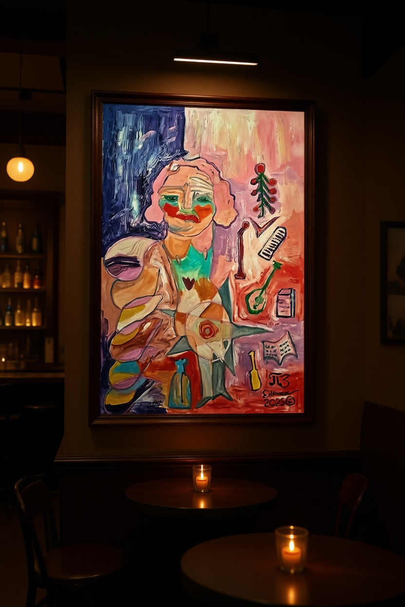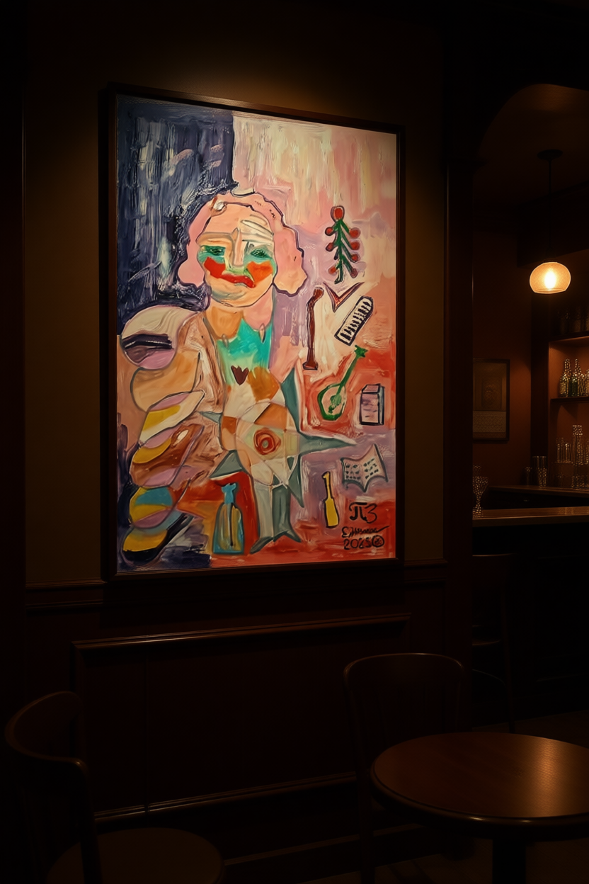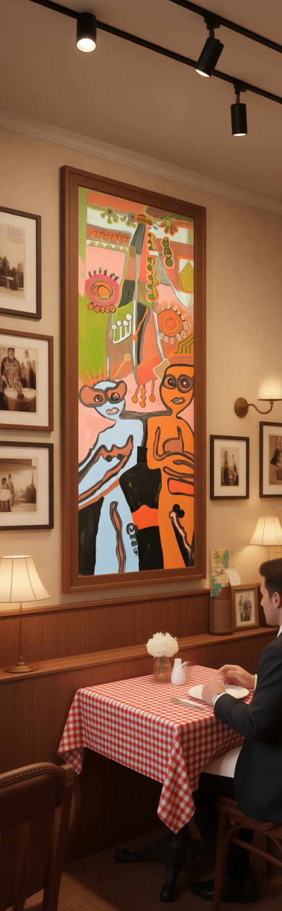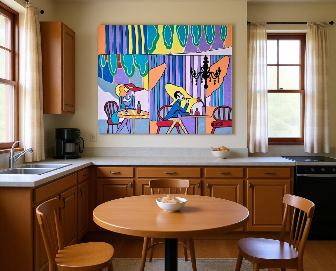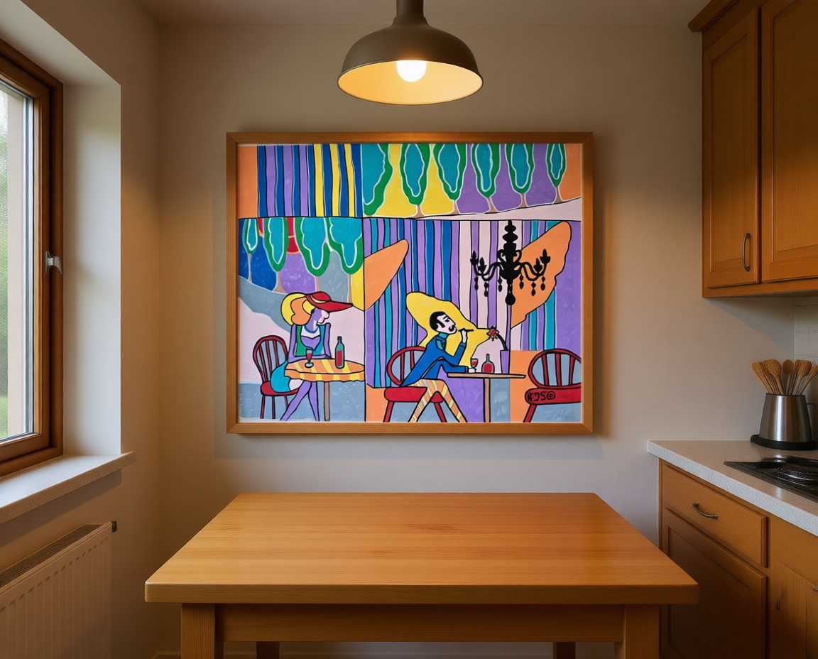 Мнение одного зрителя: "Как будто вырезка из комикса, где герои забыли про диалоги — и теперь просто сидят, пьют, и молча думают: “Ну что, дальше-то куда?” Она — в кепке, он — в синем, а между ними — бутылка и тишина. И да, почему люстра чёрная? Может, она тоже устала от их молчания… или просто не хочет мешать сцене".