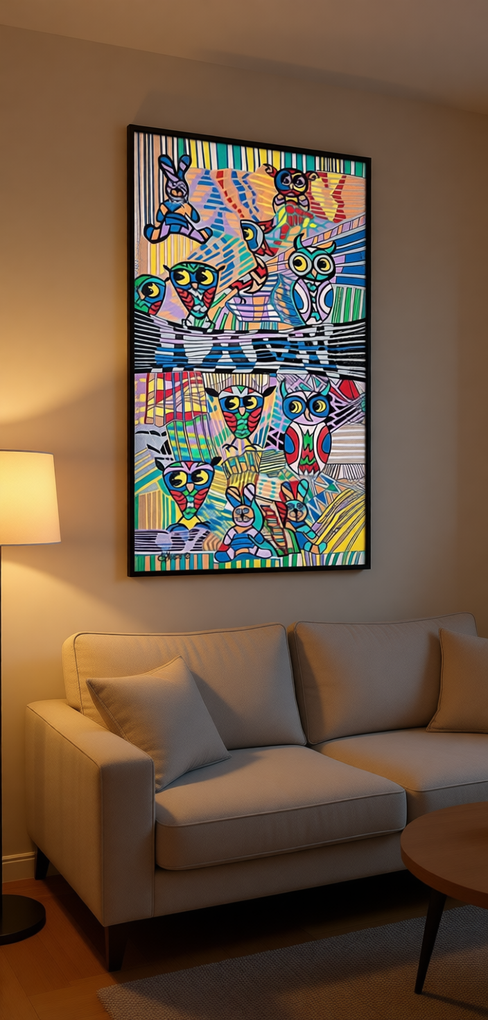 Мнение одного зрителя: "Как будто я случайно открыл дверь в мир, где животные устроили фестиваль психоделического искусства и забыли выключить музыку. Кролики сидят как философы, совы смотрят так, будто знают все мои тайны (и да, они правы), а фон — это просто взрыв красок, который заставляет меня улыбаться даже в понедельник".